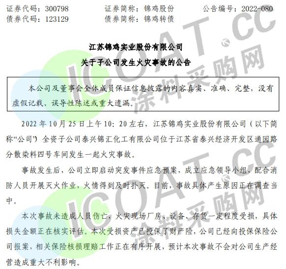 2022年10月25日,江蘇錦雞實業股份有限公司子公司泰興錦匯化工有限公司發生了一起火災事故。本次火災過火面積約300平方米,未造成人員傷亡。