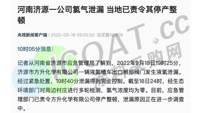 2022年9月18日,濟源市方升化學有限公司液氯汽化工段的液氯槽車出口閥門出現泄漏。