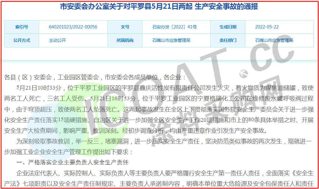 2022年5月21日,寧夏石嘴山平羅縣鑫慶活性炭有限責任公司發生火災,著火物質為煤焦油儲罐,致使2名工人死亡,3名工人受傷。