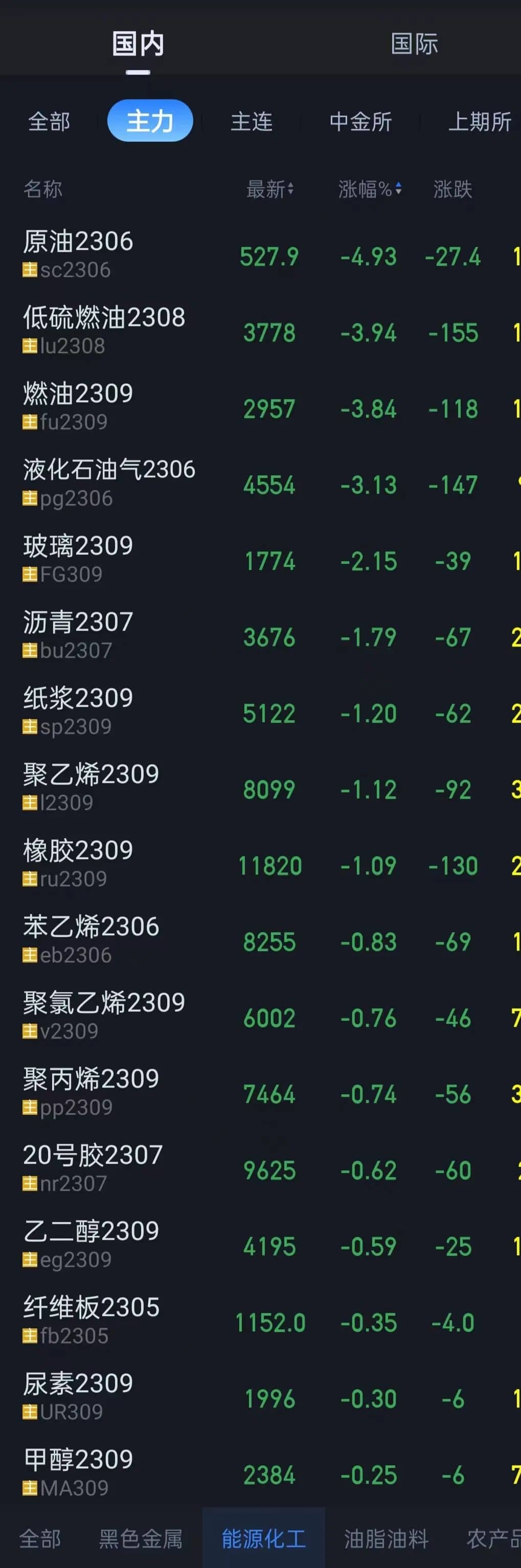 昨日(4月27日),國內商品期市原油系走低,原油跌近4%,低硫燃料油跌超3%,燃油、LPG跌近3%,聚乙烯、苯乙烯、乙二醇等多種能源化工期貨跟跌。