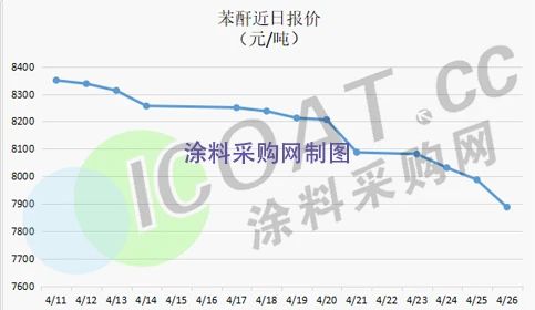 而在現(xiàn)貨市場,化工品價格下跌的大戲早已開幕,且在持續(xù)進行中。據(jù)涂料采購網(wǎng)不完全統(tǒng)計,二季度以來,多種化工品一直處于行情弱勢階段,其中不乏涂料產(chǎn)業(yè)鏈上的多種原材料和上游大化產(chǎn)品,雙氧水、新戊二醇等化工原材料價格持續(xù)下跌,苯酐更是自4月中旬之前就開始跌價,如今已經(jīng)12連跌。