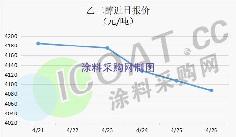 乙二醇報價4連跌,累計下跌97.5元/噸。