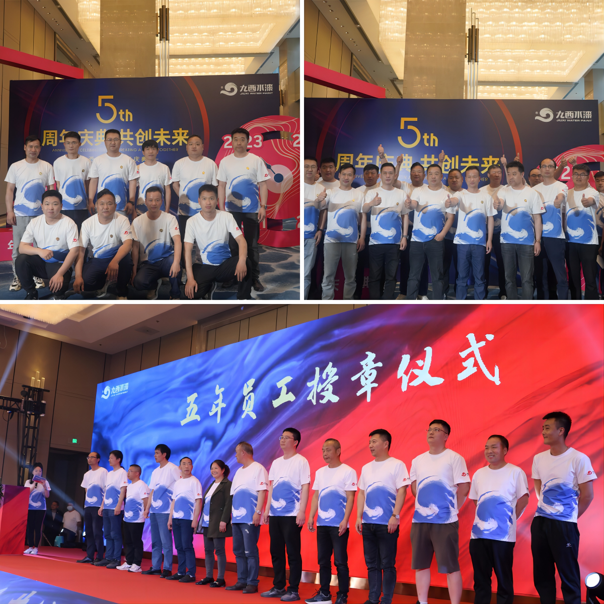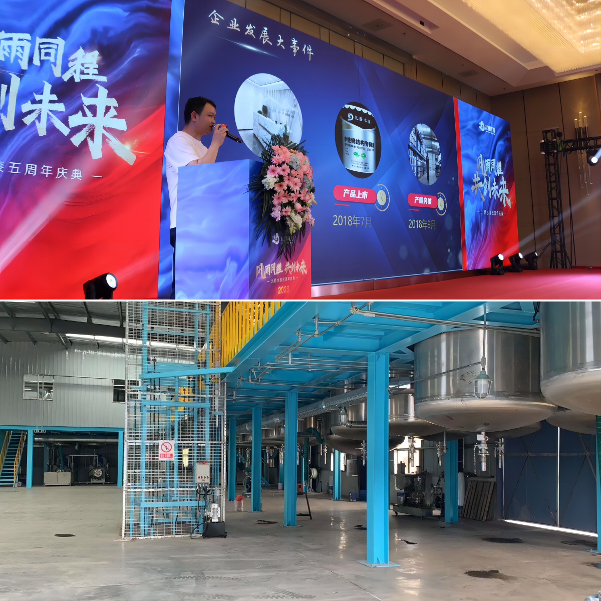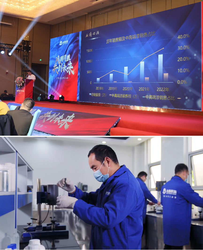 隨后,在陳董事長(zhǎng)的帶領(lǐng)之下,大家一起回顧了九西水漆五年的發(fā)展歷程以及取得的成就。陳董事長(zhǎng)表示:回溯往昔,一幅幅平凡而充滿感動(dòng)的歷史片段在我們眼前浮現(xiàn)。2017年初,九西的第一次籌建會(huì)議召開,確定了九西最初的核心團(tuán)隊(duì),技術(shù)儲(chǔ)備方向,確定企業(yè)定位及企業(yè)發(fā)展方向等,九西籌備組正式成立并快速展開工作,技術(shù)儲(chǔ)備的產(chǎn)品驗(yàn)證及產(chǎn)品定位,在當(dāng)時(shí)市場(chǎng)情況下以解決高濕地區(qū)的施工難問題,和某些行業(yè)浸涂漆的抗油問題。產(chǎn)品市場(chǎng)定位清晰、應(yīng)用特點(diǎn)明確。廠房、廠址、產(chǎn)能的確定,并迅速推動(dòng)工作進(jìn)展。核心團(tuán)隊(duì)開展各自擅長(zhǎng)的工作。通過一年的籌備工作,九西雛形初顯,2018年3月開始投建安裝設(shè)備。2018年4月28日,也就是5年前的今天,九西正式投產(chǎn),也標(biāo)志著九西水漆正式踏上了環(huán)保型水性工業(yè)漆制造商之路。