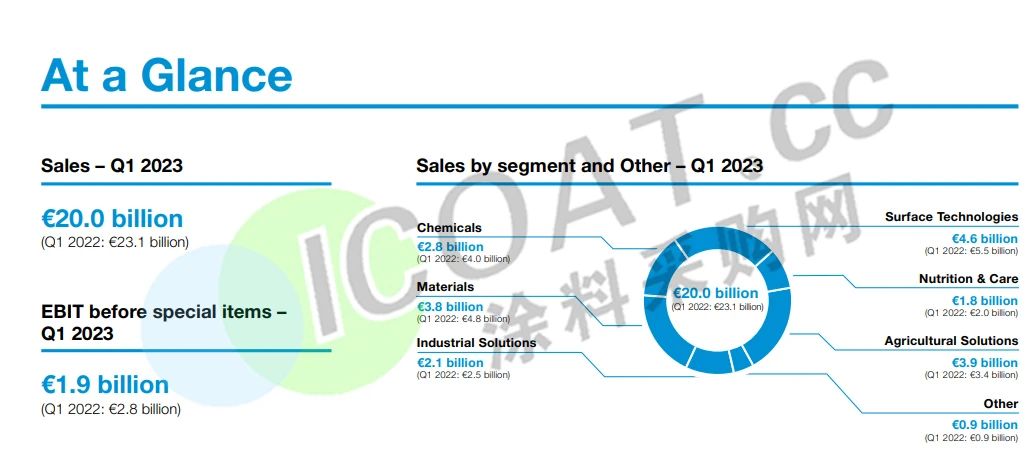巴斯夫集團2023年一季度銷售額為200億歐元(約合人民幣1522億元),相比去年一季度減少31億歐元,同比下降13.4%,其主要原因是幾乎所有的業務領域均受到需求疲軟的影響,導致銷量下滑。不計特殊項目的息稅前收益19億歐元(約合人民幣144億元),同比下降31.5%,這主要由于化學品和材料業務領域的盈利大幅下降。