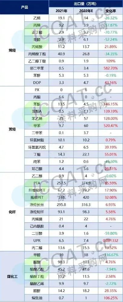 2022年化工行業(yè)累計(jì)出口額3049.5億美元,占全行業(yè)累計(jì)出口總額比重為80.4%。其中烯烴、芳烴、化纖、煤化工等領(lǐng)域的乙烯、丙烯、正丁醇、PX、二甲苯、雙酚A等多種化工品出口數(shù)量較大,全年約2000萬(wàn)噸化工品出口,涉及品類(lèi)近400種。