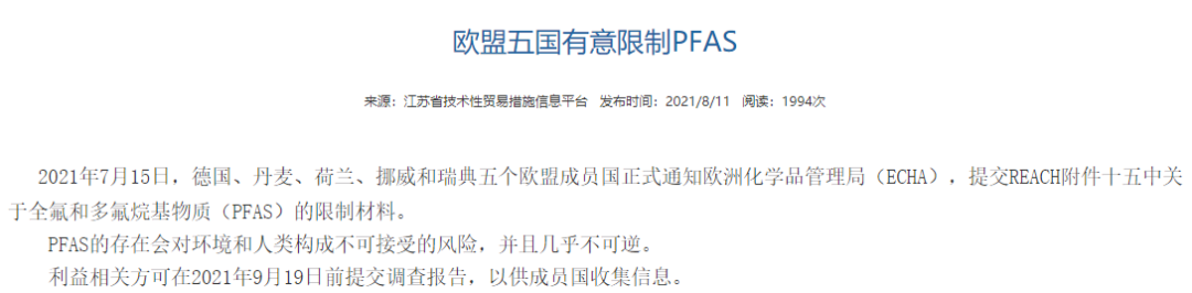 德國廣播聯盟報道,歐盟委員會隨后將與成員國一起決定對如何對生產和使用PFAS進行法律約束和限制。根據聯邦環境署的說法,限制可能最早要到2025年就能實現。