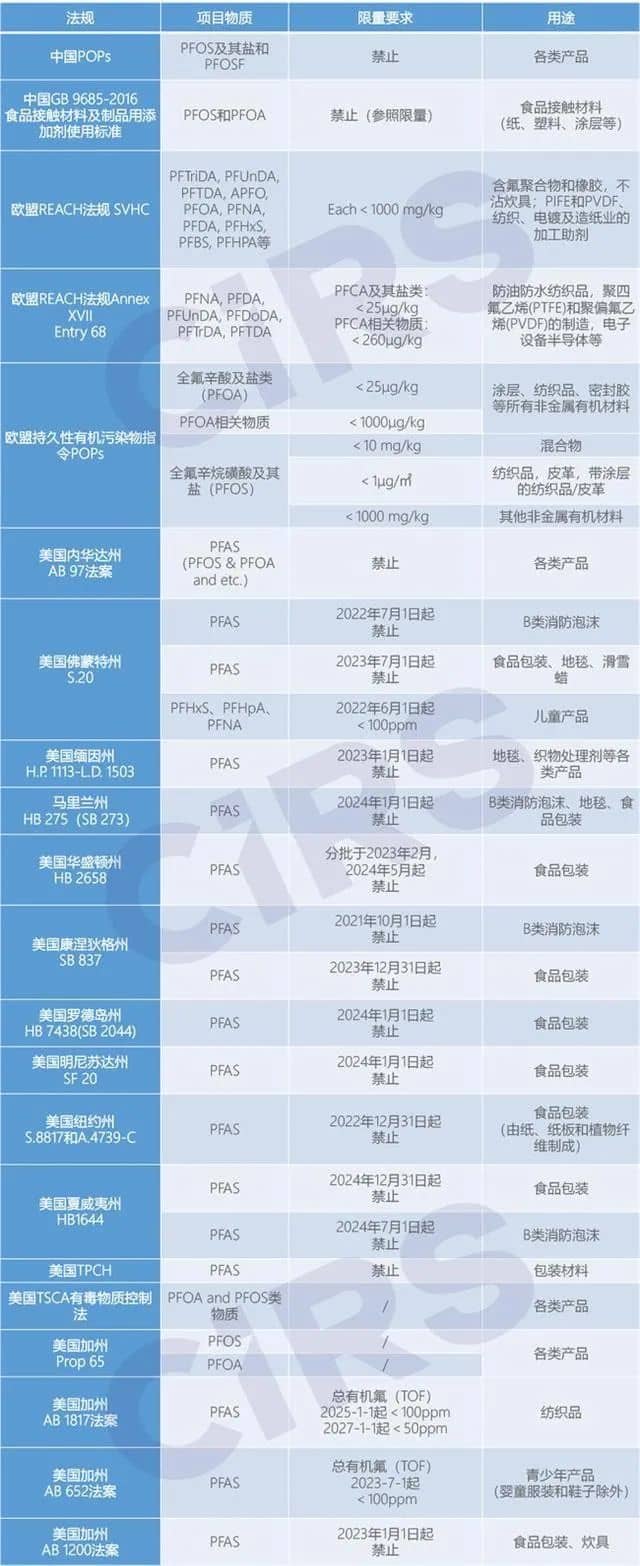 美國針對包裝材料的TPCH,從2021年起將PFAS作為包裝材料中管控的物質,要求不得檢出。
