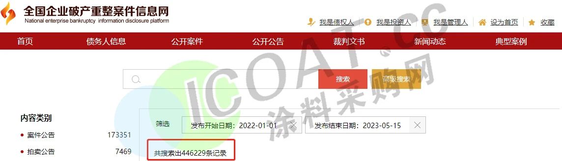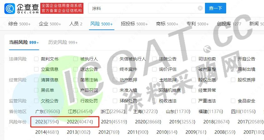 全國企業破產重整案件信息網數據顯示,2022年以來,已有超過44萬條破產重整記錄,僅在涂料行業,就有40000多家涂料企業陷入風險,其中被列入被執行人、失信被執行人的約1500家,有開庭公告和立案信息的約12000家,限制高消費和限制出境的約3000家。