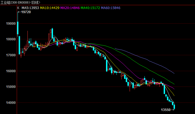 工業硅市場,四川、云南、江蘇、廣東等地現貨價格持續下滑。四川441#工業硅報價13900元/噸,創年內新低,5月份以來已累計下滑12.3%。近兩周時間,工業硅期現價格雙雙下跌超1000元/噸。下游的多晶硅單晶用料價格報120元/千克,5月份以來已累計下滑27.53%。