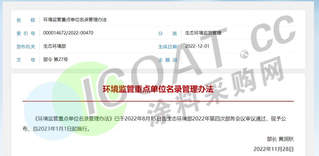 2022年12月,生態環境部發布了《環境監管重點單位名錄管理辦法》,自2023年1月1日起施行。根據《辦法》規定,具備下列條件之一的,應當列為大氣環境重點排污單位,其中就包括“工業涂裝行業規模以上企業,全部使用符合國家規定的水性、無溶劑、輻射固化、粉末等四類低揮發性有機物含量涂料的除外”。