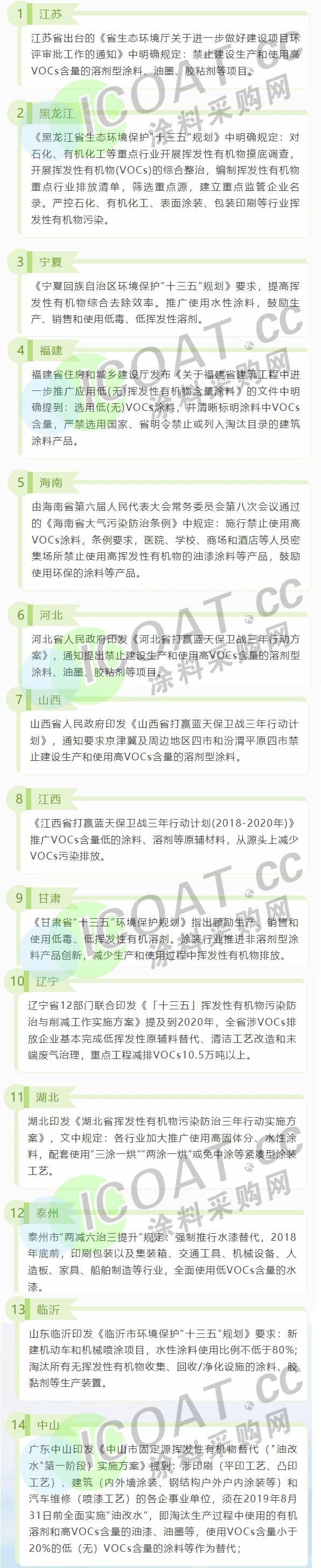 除此之外,河南、山西、福建等多個省市地區均在近期發布了對于溶劑型涂料的“禁限令”,要求加快實施低VOCs含量原輔材料替代,對使用溶劑型涂料、油墨、膠粘劑、清洗劑的企業進行摸排,建立管理臺賬。