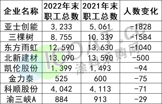 通過涂料上市公公司2022年財報數據可知,多家涂企2022年年末職工總數較2021年末職工總數有所減少。這還只是公開了的數據,未公開的數據卻難以明晰,但涂料行業被優化掉的職工遠不止表格中的5200余人。