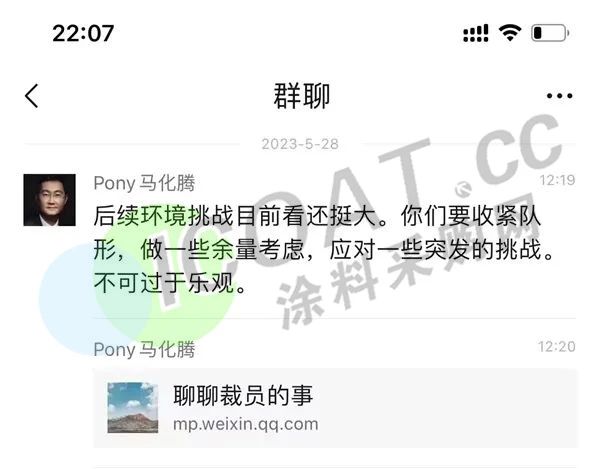 馬化騰在微信群中轉發了一篇《聊聊裁員的事》的文章,并表示:“后續環境挑戰目前看還挺大,你們要收緊隊形,做一些余量考慮,應對一些突發的挑戰,不可過于樂觀”。