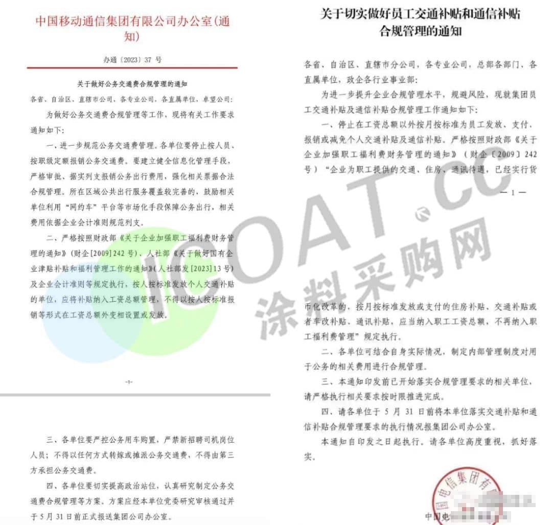 有消息稱,中國聯通、中國移動、中國電信的員工近期收到通知,稱通信補貼、交通補貼取消了。網上流傳的通知顯示,要在合規管理或減免個人交通、通信補貼等。某員工表示,部分一線員工每個月就一千多元工資,靠一些補貼提高收入,現在是變相逼人走。還有員工表示之前每月有1200元交通補貼,已收到通知六月起取消,這意味著到手工資即將減半。
