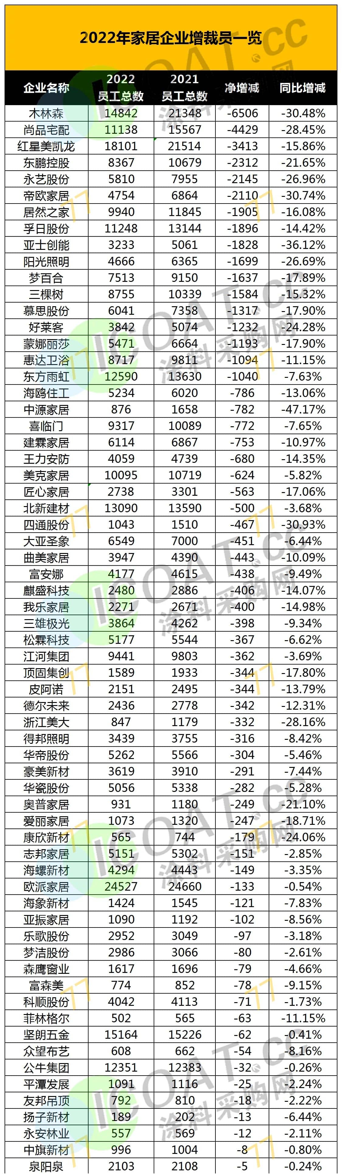 據上市公司2022年財報統計,95家上市家居企業中,共有66家企業2022年員工相比2021年員工總數減少,減員企業占比超過67%,減少員工總數為51115名。其中,木林森、尚品宅配同比分別減少了6506人、4429人。