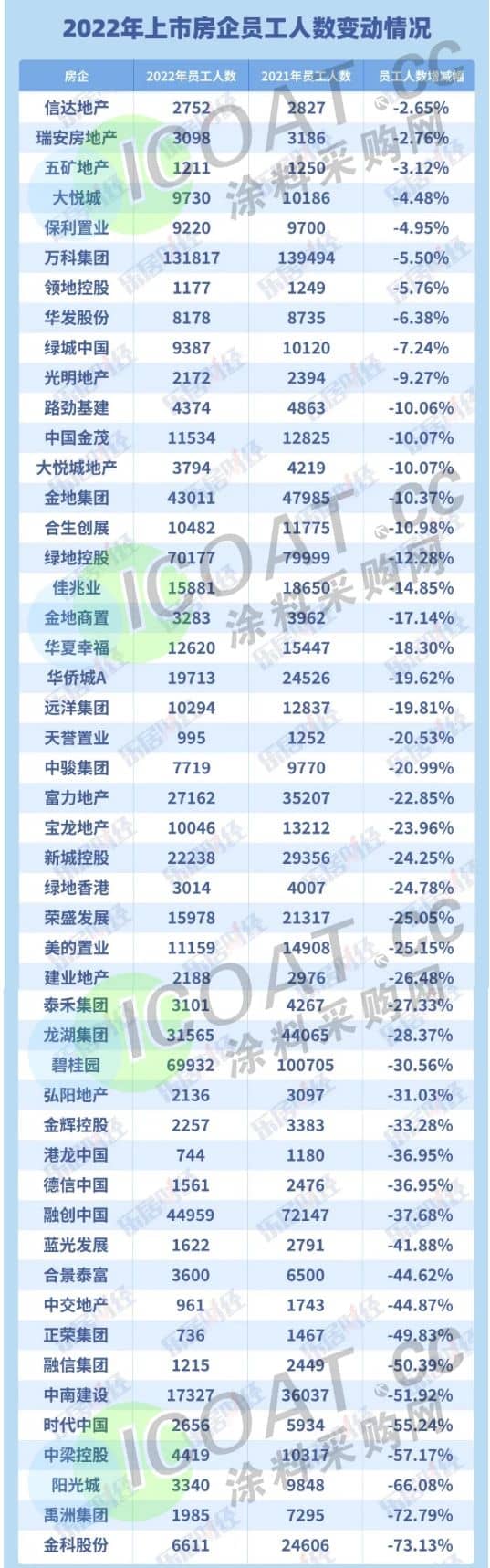 相比2019年,三年來地產開發從業人員減少了40萬,地產開發上下游產業減少約600萬個崗位。2022年,57家典型上市房企總員工人數為127.7萬人,同比上年度減少約11.65%,減員人數高達18.6萬人。共有47家員工人數同比減少,比例多在20-40%之間。