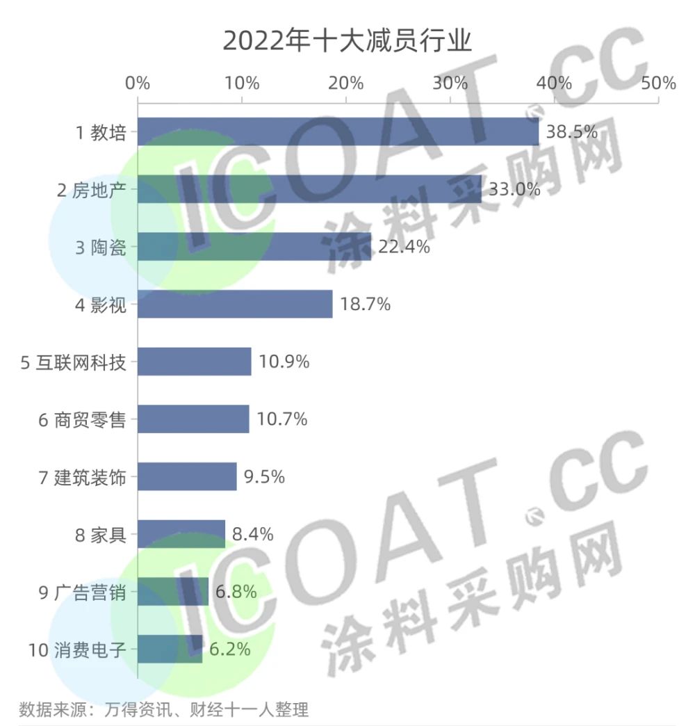 根據機構報告,2022年十大減員行業分別是教培、房地產、陶瓷、影視、互聯網科技、商貿零售、建筑裝飾、家具、廣告營銷、消費電子。而看看2023年的情況,裁員涉及的范圍顯然更廣,企業也更多,且產業鏈上游的多個分支也受到了影響,裁員降薪也由“突發新聞”變成了常態化。