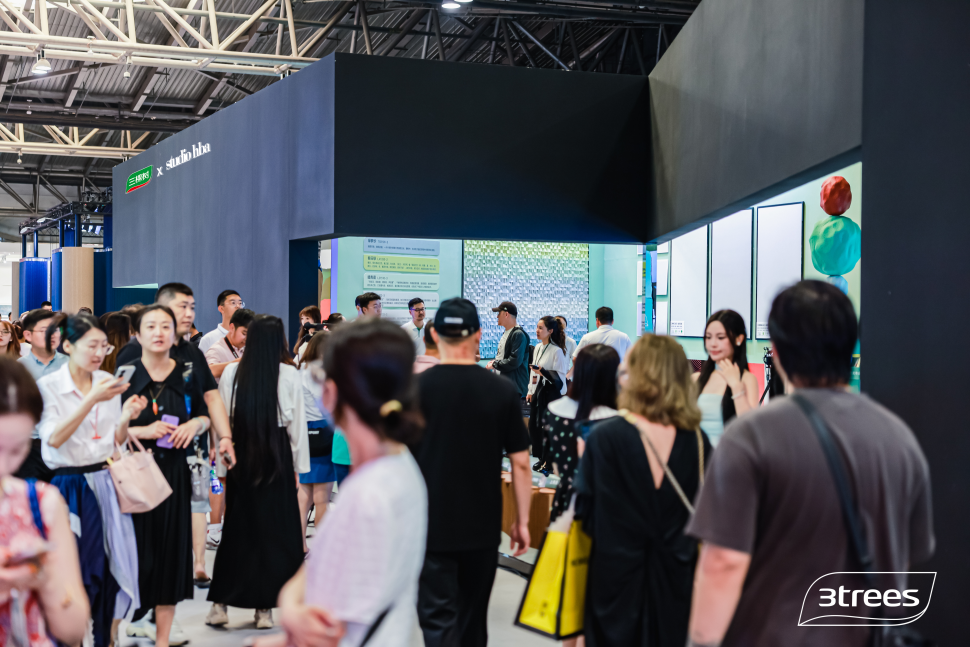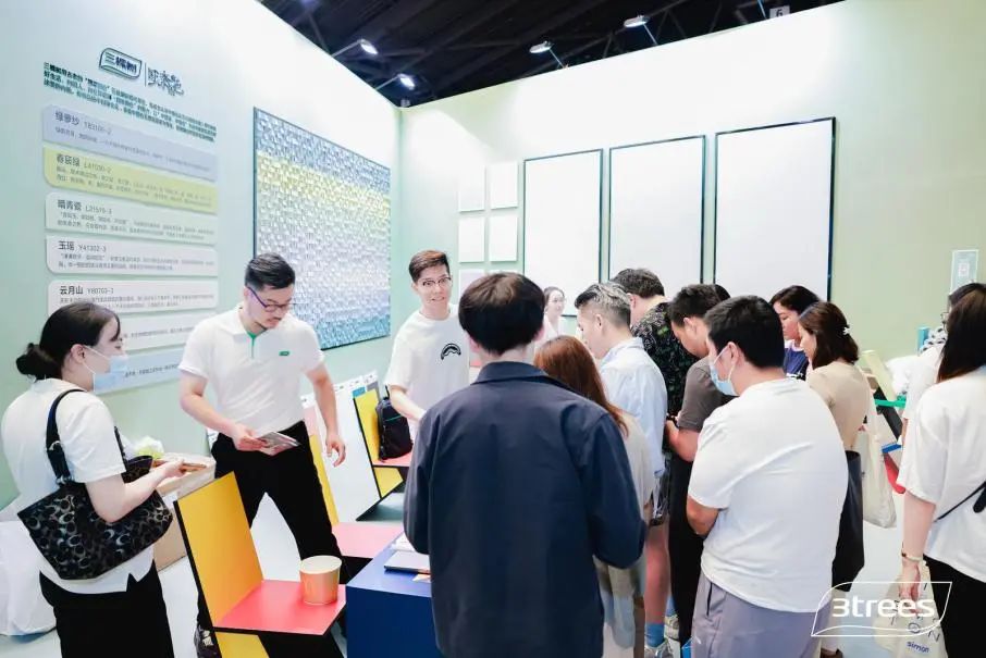 在設計上海的現場,三棵樹以眾多健康環保且富有藝術美學的材料,吸引眾多行業內外人士的關注與討論。在展臺內有小森板、藝術漆、國企國色、網紅打卡通道等不同功能性區域,并邀請大咖現場分享創作靈感與市場思考,彰顯品牌對于美學與市場的深入探索與成就。