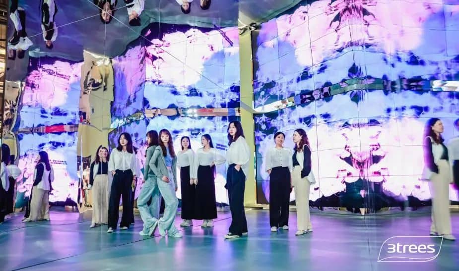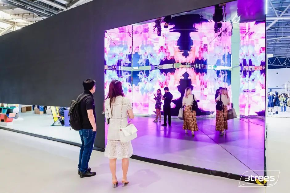 本次三棵樹展臺是由三棵樹空間設計部與Studio HBA赫室作聯合設計打造,以「流動色彩,迷幻詩意」為設計主題,將溫柔、純粹、美好的綠色定為主色調,打造一處療愈、放松的心靈之所。