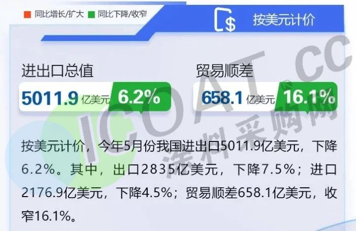 事實上,光伏行業的出口受到壓制只是近期國內外貿行業的一個縮影,多方的制裁和約束,也讓國內的外貿企業走入更深的困境。據海關統計,今年5月份,我國進出口3.45萬億元,增長0.5%。其中,出口1.95萬億元,下降0.8%;按美元計價,今年5月份我國進出口5011.9億美元,下降6.2%。其中,出口2835億美元,下降7.5%。貿易順差658.1億美元,收窄16.1%。