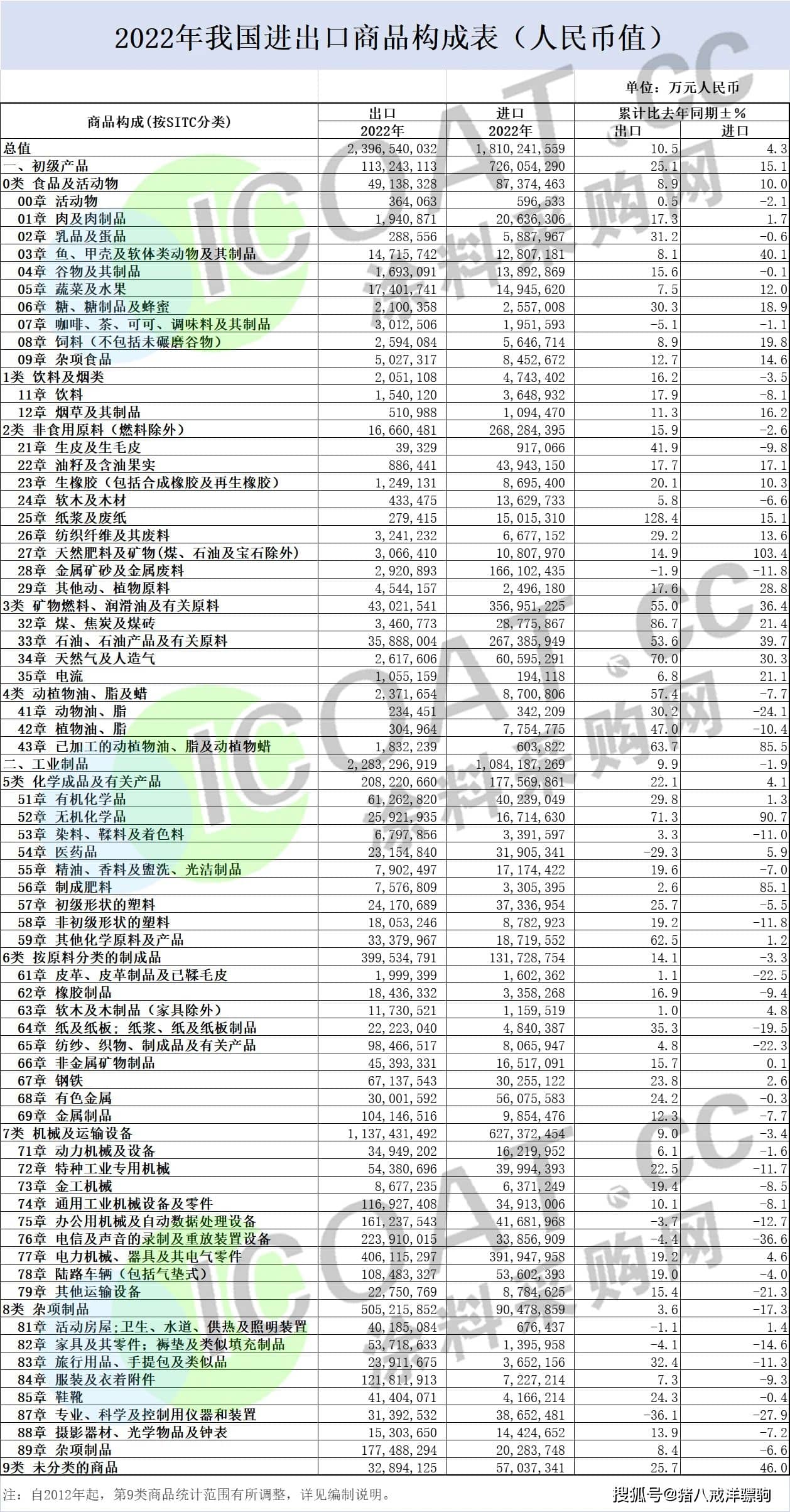 外貿市場回暖并不如預期,我國出口產品也受到波及。2022年我國出口商品最多的是“工業制品”。其中,機械及運輸設備出口22.8萬億元、雜項制品出口5.1萬億元、按原料分類的制成品出口4萬億元、化學成品及有關產品出口2.1萬億元、食品及活動物出口4914億元。