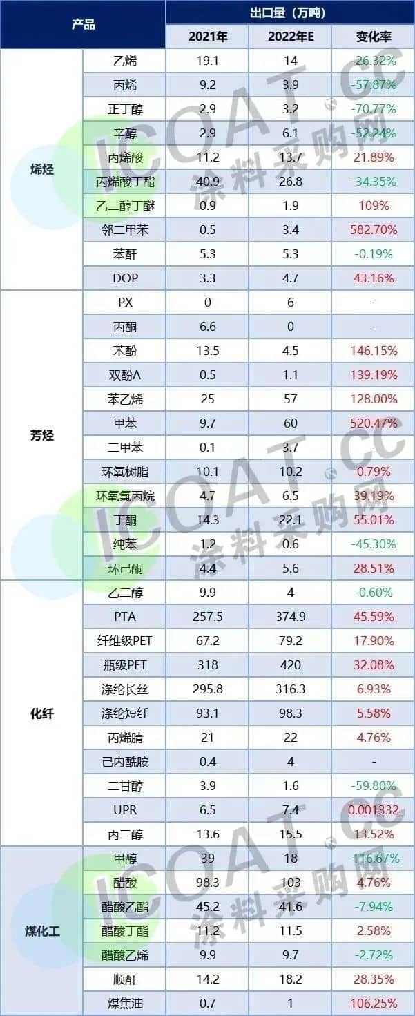 而在化工領域,也有不少烯烴類、芳烴類、化纖類和煤化工類產品依賴出口外貿進行銷售,2022年累計出口超過1700萬噸。PTA、PET、滌綸長絲的出口量均超過100萬噸。乙烯、丙烯、正丙酮、辛醇、丙烯酸丁酯、苯酐、乙二醇、純苯、二甘醇、醋酸乙酯、醋酸乙烯等化工品出口量同比呈現減少態勢。