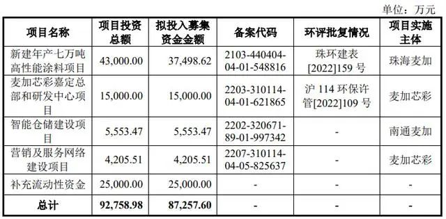 招股書(shū)顯示,麥加芯彩本次上市擬公開(kāi)發(fā)行不超過(guò)2700萬(wàn)股,擬募集資金8.73億元,將3.75億元用于新建年產(chǎn)七萬(wàn)噸高性能涂料項(xiàng)目,1.5億元用于麥加芯彩嘉定總部和研發(fā)中心項(xiàng)目,5553.47萬(wàn)元用于智能倉(cāng)儲(chǔ)建設(shè)項(xiàng)目,4205.5萬(wàn)元用于營(yíng)銷(xiāo)及服務(wù)網(wǎng)絡(luò)建設(shè)項(xiàng)目,2.5億元用于補(bǔ)充流動(dòng)性資金。
