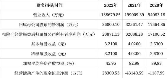 招股書(shū)顯示,麥加芯彩2020年、2021年、2022年?duì)I收分別為9.4億元、19.9億元、13.9億元;凈利分別為1.76億元、3.26億元、2.6億元;扣非后凈利分別為1.7億元、3.2億元、2.4億元。