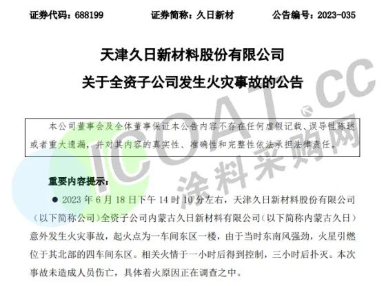 近日,化工行業上市公司天津久日新材料股份有限公司發布公告,稱全資子公司內蒙古久日意外發生火災事故,本次事故未造成人員傷亡,具體著火原因正在調查之中。