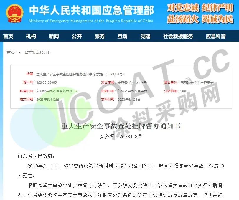 5月1日,中化集團魯西化工集團聊城魯西雙氧水新材料科技有限公司發生爆炸著火事故,事故造成10人死亡。