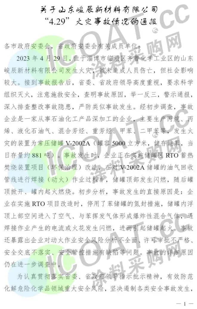 4月29日,山東淄博峻辰新材料有限公司西罐區一純苯儲罐(內浮頂罐,容積5000立方)發生火災事故,未造成人員傷亡。