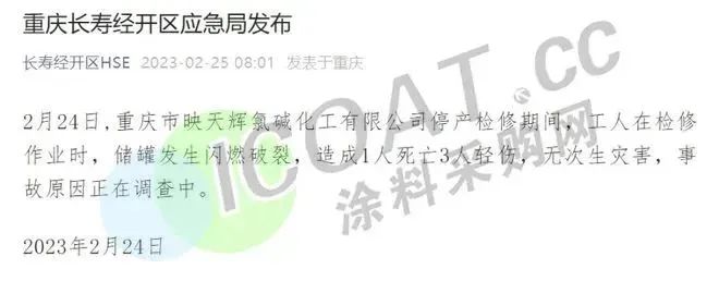 2月24日,重慶市映天輝氯堿化工公司停產檢修期間,工人檢修作業時儲罐發生閃燃破裂,造成1人死亡3人輕傷,事故原因正調查。