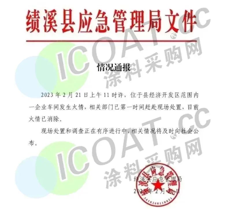 2月21日,安徽宣城市績溪縣祥云路附近一化工廠起火,起火點系一家殺蟲劑生產工廠,主營業務是殺蟲劑原藥的稀釋和罐裝。