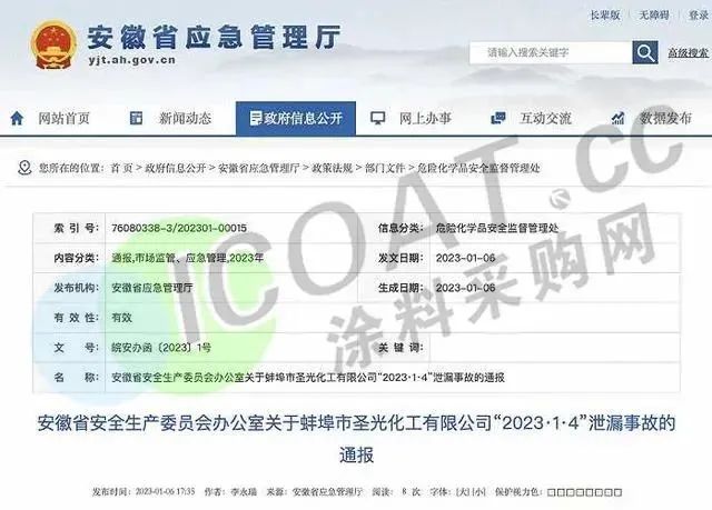 1月4日,安徽省蚌埠市圣光化工有限公司發生混酸(硫酸和硝酸混合物)泄漏事故,事故未造成人員傷亡,但造成較大社會影響。