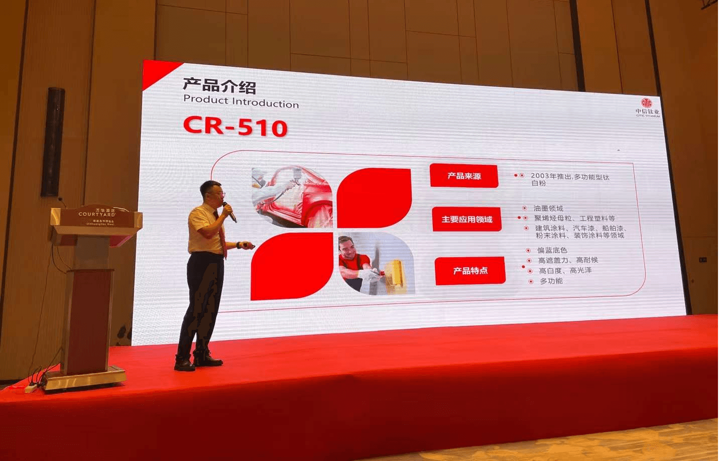 中信鈦業(yè)銷售工程師任健為大家?guī)怼冻掷m(xù)創(chuàng)新,為涂企賦能》的分享,為與會嘉賓講解了CR510、R2、R3等新研發(fā)的多功能鈦白粉系列產(chǎn)品,并對該系列產(chǎn)品優(yōu)異的高遮蓋力、高耐候、高白度、高光澤和偏藍底色等特點進行了詳細的闡述,目前該系列產(chǎn)品廣泛應(yīng)用于油墨、涂料、工程塑料等領(lǐng)域,可以同時滿足用戶使用鈦白粉的多種需求,有效為用戶降低庫存成本。這也推動了戴卡涂料供應(yīng)商與中信鈦業(yè)緊密合作,從而形成涂料在產(chǎn)品上的突破。