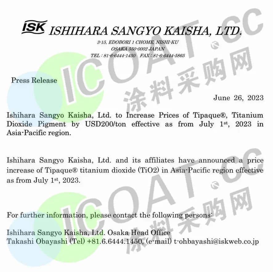 近日,日本石原ISK發布漲價函,稱7月1日起,鈦白粉在亞太地區價格將上調200美元/噸。