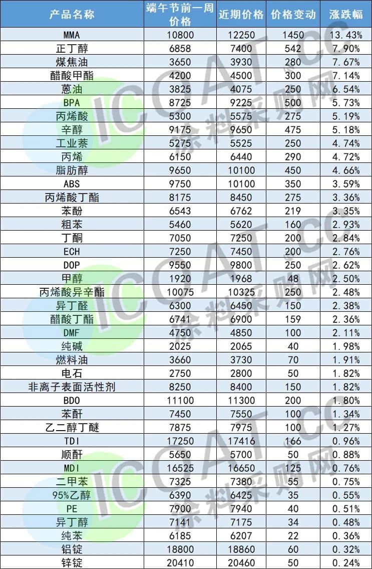 涂料采購網信息中心數據顯示,40多種化工品價格較半個月前(端午前一周)報價有所上調,但幅度普遍較小,其中MMA小漲13%。