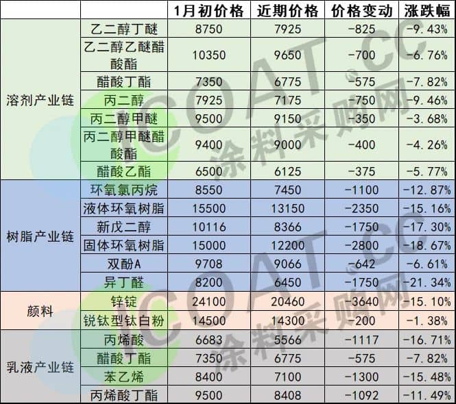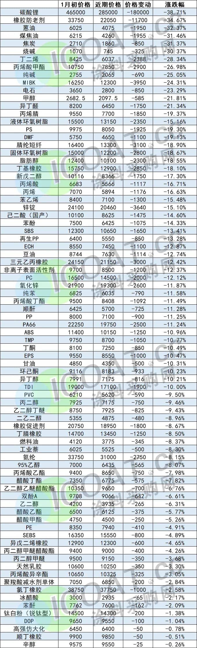 這其中不乏此前因下游拉動而價格暴漲的碳酸鋰,也有涂料產業鏈上游的銳鈦型鈦白粉、環氧樹脂等多種化工原材料,丙烯酸丁酯、雙酚A、環氧氯丙烷、新戊二醇、異丁醛、TDI等通用大化產品,噸價下跌超千元者眾多,價格下跌比例在5%-15%左右。