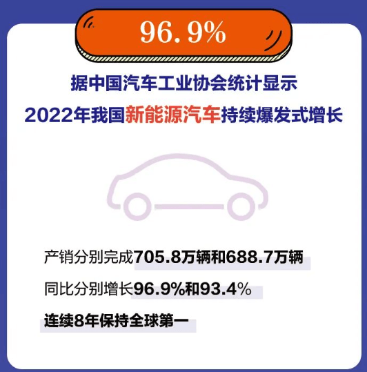 新能源汽車的發展速度相信大家有目共睹,據工信部副部長辛國斌介紹,2022年我國新能源汽車產銷實現705.8萬輛和688.7萬輛,同比分別增長96.9%和93.4%,市場占有率達到25.6%,我國新能源汽車的產銷連續8年位居世界第一。