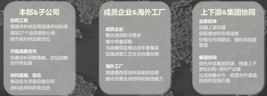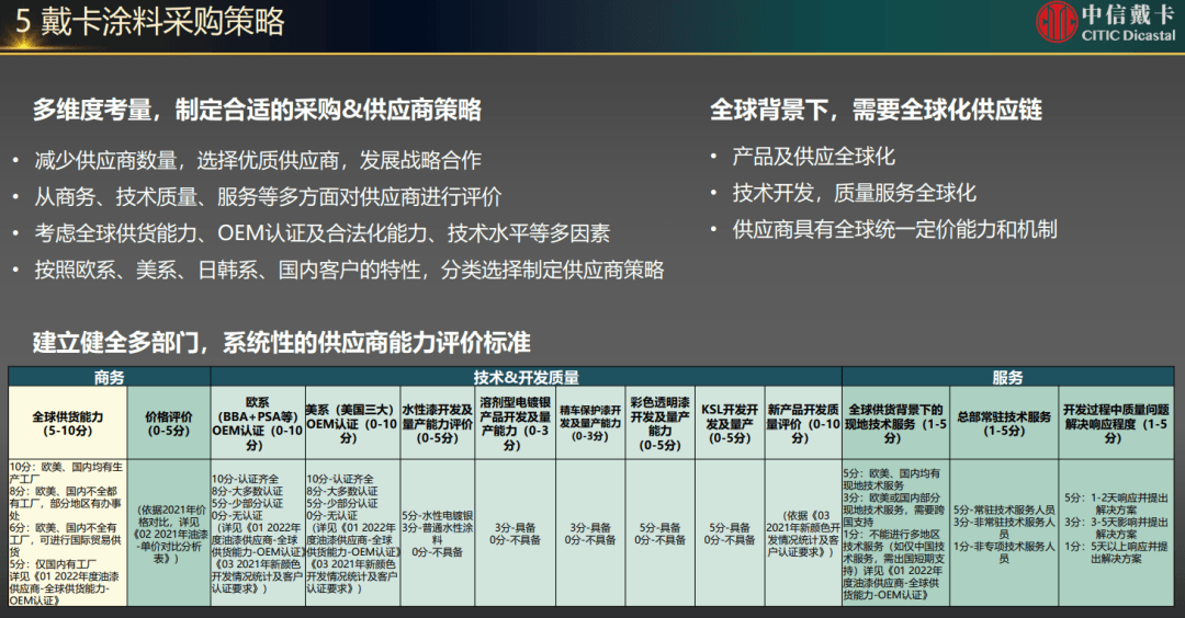在涂料廠最為關注的全球涂料涂裝供應鏈建設方面,中信戴卡堅持本部&子公司聯合,搭建涂料供應商選擇評估標準,指定27個油漆顏色分類,按市場對供應商定位。完善涂料采購策略,定位戰略合作供應商,推動自主涂裝設備應用,涂料應用向研發邁進。