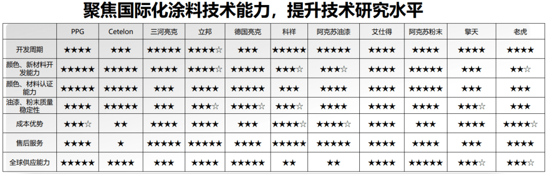 中信戴卡從涂料技術能力和研究水平方面,對中外多家涂料企業進行了對比,其中PPG、三河亮克、立邦、德國亮克、科祥、阿克蘇、擎天、Cetelon等涂料企業在部分領域獲得五星評價,得到了中信戴卡的認可。