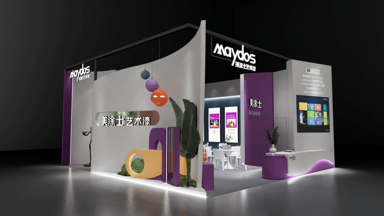 本次展會(huì)沿用“方寸之間,讓家更美”的展館設(shè)計(jì),融合了品牌的標(biāo)準(zhǔn)色——美涂士紫,并以溫柔而優(yōu)雅的丁香灰為主色,時(shí)尚簡(jiǎn)約而不失活力!再以日晷黃、瑪奇朵焦糖色、夏日之歌藍(lán)等為點(diǎn)綴色,采用現(xiàn)代化的展示手法,使用燈光、投影等技術(shù)來突出展示的亮點(diǎn),創(chuàng)造出一個(gè)富有東方韻味的藝術(shù)空間,給現(xiàn)場(chǎng)觀眾帶來一場(chǎng)視覺盛宴。此外,展館還會(huì)運(yùn)用產(chǎn)品樣板、微水泥梯步景觀等元素進(jìn)行裝飾,提高整體的協(xié)調(diào)性,也更深刻地詮釋了美涂士“讓世界更環(huán)保、更美麗”的企業(yè)愿景。