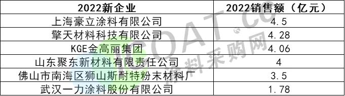 同時我們可以看到,2022年銷售額100強新上榜企業共6家,分別為上海豪立涂料有限公司、擎天材料科技有限公司、KGE金高麗集團、山東聚東新材料有限責任公司、佛山市南海區獅山斯耐特粉末材料廠、武漢一力涂料股份有限公司,銷售額在1.78億元-4.5億元左右,且多半都是民族企業。這也意味著民族企業正在崛起,有很大的希望能夠在未來幾年看到越來越多的民族企業上榜涂料銷售額TOP100的榜單。