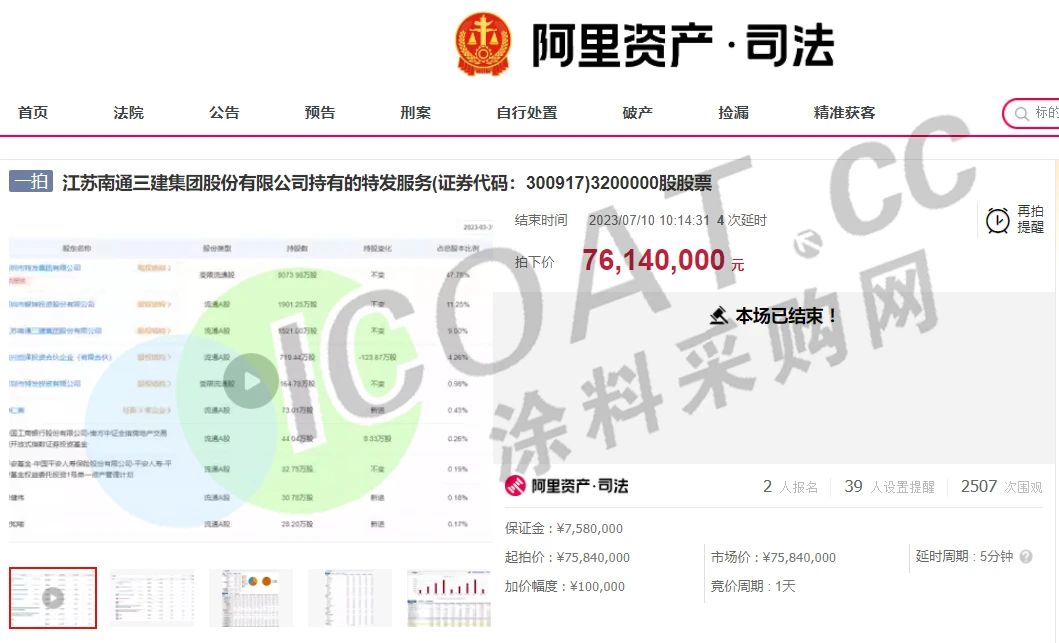 近日,深圳市特發服務股份有限公司公告,股東江蘇南通三建集團股份有限公司股份將被司法拍賣。南通三建所持有的特發服務無限售條件流通股共計320萬股,占其所持全部股份的21.04%,占特發服務總股本的1.89%。截至目前,南通三建所持特發服務股份15,210,000股,累計被凍結股數15,210,000股,累計被拍賣14,510,000股,占其所持全部股份的95.40%。
