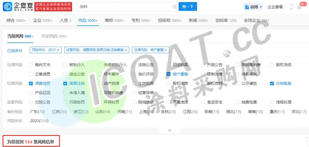 而據企查查平臺信息,2023年至今,涂料行業涉及破產重整、清算信息、簡易注銷、注銷備案的企業共534家,自重廣東、江蘇、浙江、山東等華南華東區域占比較大,上海、吉林、江西、安徽、湖北等地區也有不同程度的波及。