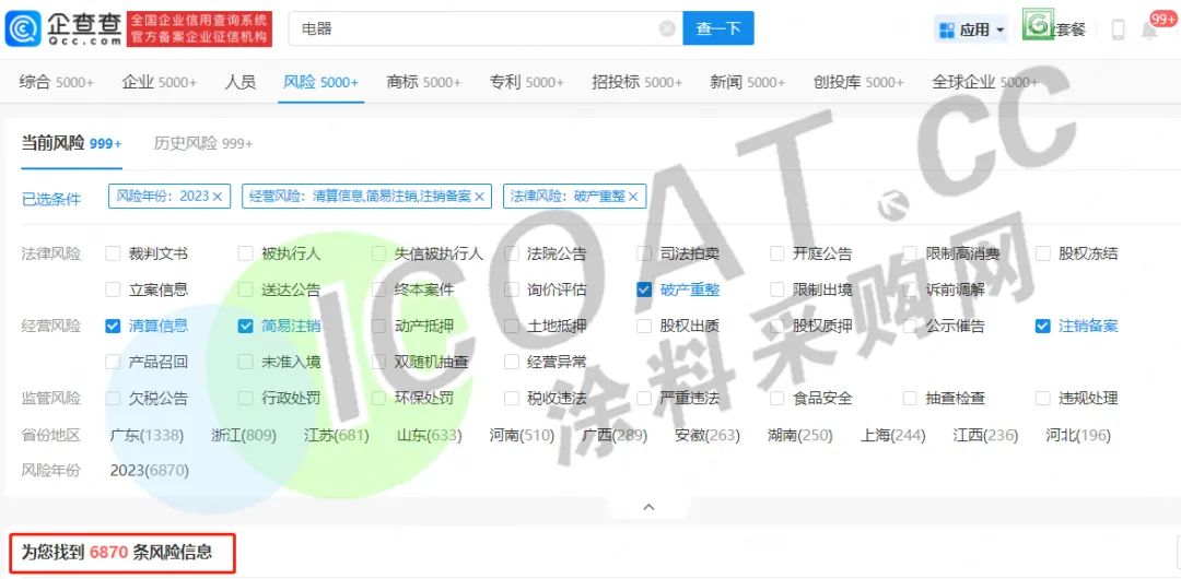 電器行業:破產、清算、注銷6870家,包括電器設備、電器銷售、電器維修、冰箱配件、電器安裝等細分領域。