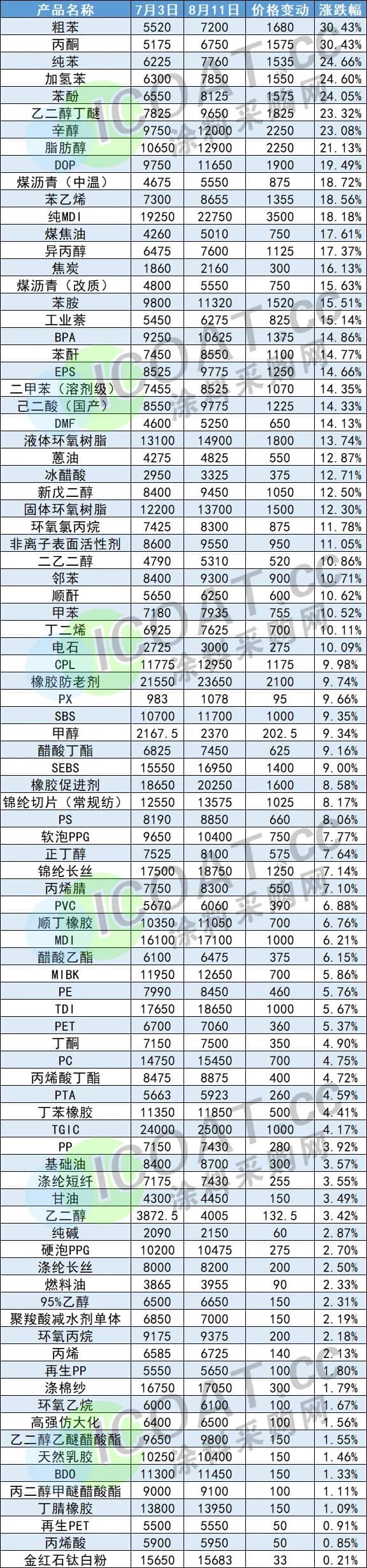 盡管下半年僅過了不到2個月,但化工市場卻呈現出一發不可收拾的漲價態勢,丙二醇、純苯、粗苯、MDI、環氧樹脂等90多種化工品價格上升,噸價最高上漲3500元,漲幅最高超過30%。