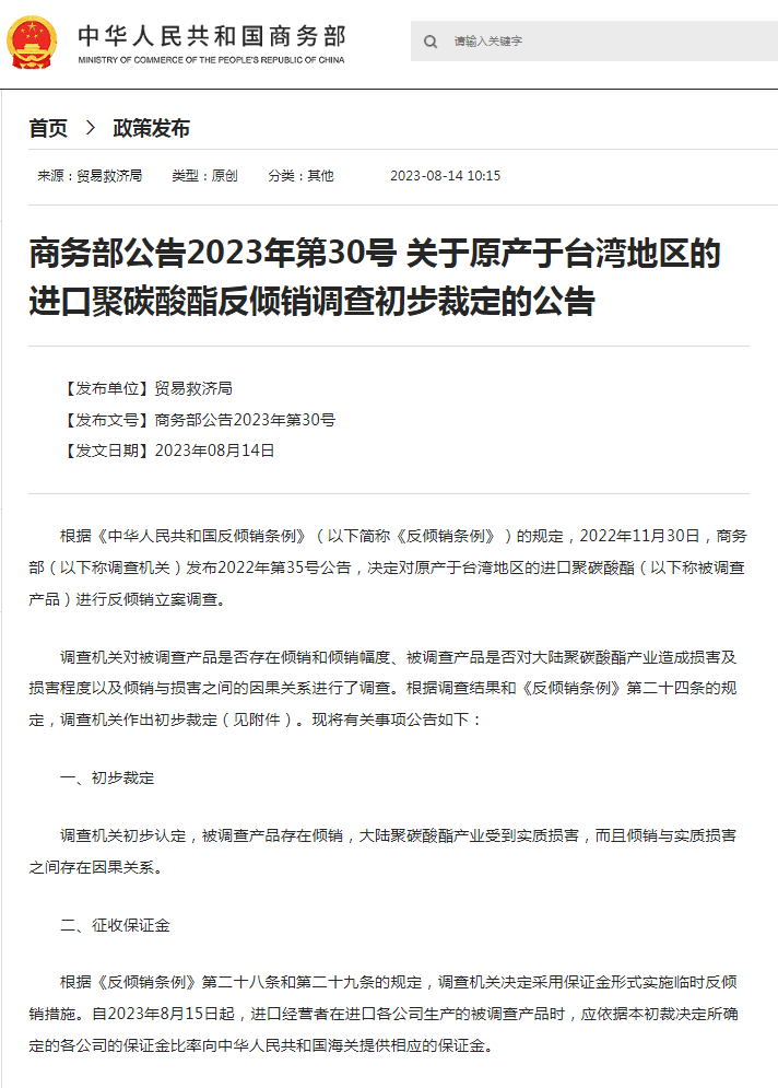 調(diào)查機關對被調(diào)查產(chǎn)品是否存在傾銷和傾銷幅度、被調(diào)查產(chǎn)品是否對大陸聚碳酸酯產(chǎn)業(yè)造成損害及損害程度以及傾銷與損害之間的因果關系進行了調(diào)查。根據(jù)調(diào)查結(jié)果和《反傾銷條例》第二十四條的規(guī)定,調(diào)查機關作出初步裁定(見附件)?,F(xiàn)將有關事項公告如下:一、初步裁定調(diào)查機關初步認定,被調(diào)查產(chǎn)品存在傾銷,大陸聚碳酸酯產(chǎn)業(yè)受到實質(zhì)損害,而且傾銷與實質(zhì)損害之間存在因果關系。二、征收保證金根據(jù)《反傾銷條例》第二十八條和第二十九條的規(guī)定,調(diào)查機關決定采用保證金形式實施臨時反傾銷措施。自2023年8月15日起,進口經(jīng)營者在進口各公司生產(chǎn)的被調(diào)查產(chǎn)品時,應依據(jù)本初裁決定所確定的各公司的保證金比率向中華人民共和國海關提供相應的保證金。被調(diào)查產(chǎn)品的具體描述如下:調(diào)查范圍:原產(chǎn)于臺灣地區(qū)的進口聚碳酸酯。被調(diào)查產(chǎn)品名稱:聚碳酸酯。英文名稱:Polycarbonate,簡稱PC。結(jié)構(gòu)式: