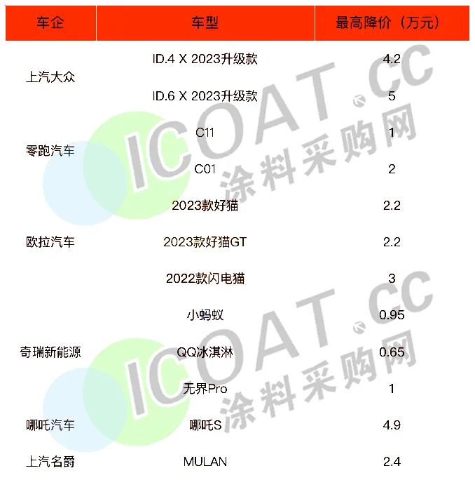 據涂料采購網不完全統計,8月以來,上汽大眾、蔚來、零跑、奇瑞、長城歐拉、埃安、哪吒、上汽名爵、理想、問界等10多個品牌先后宣布降價或變相優惠,現金補貼、免費保養、終身維護、優惠延長等大招頻出,只為刺激市場,拉動銷量。