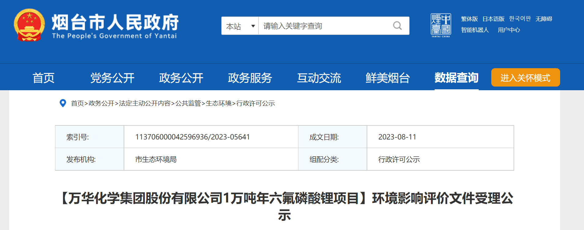 8月11日,煙臺市生態環境局就萬華化學集團股份有限公司1萬噸/年六氟磷酸鋰項目環境影響評價文件進行受理公示。